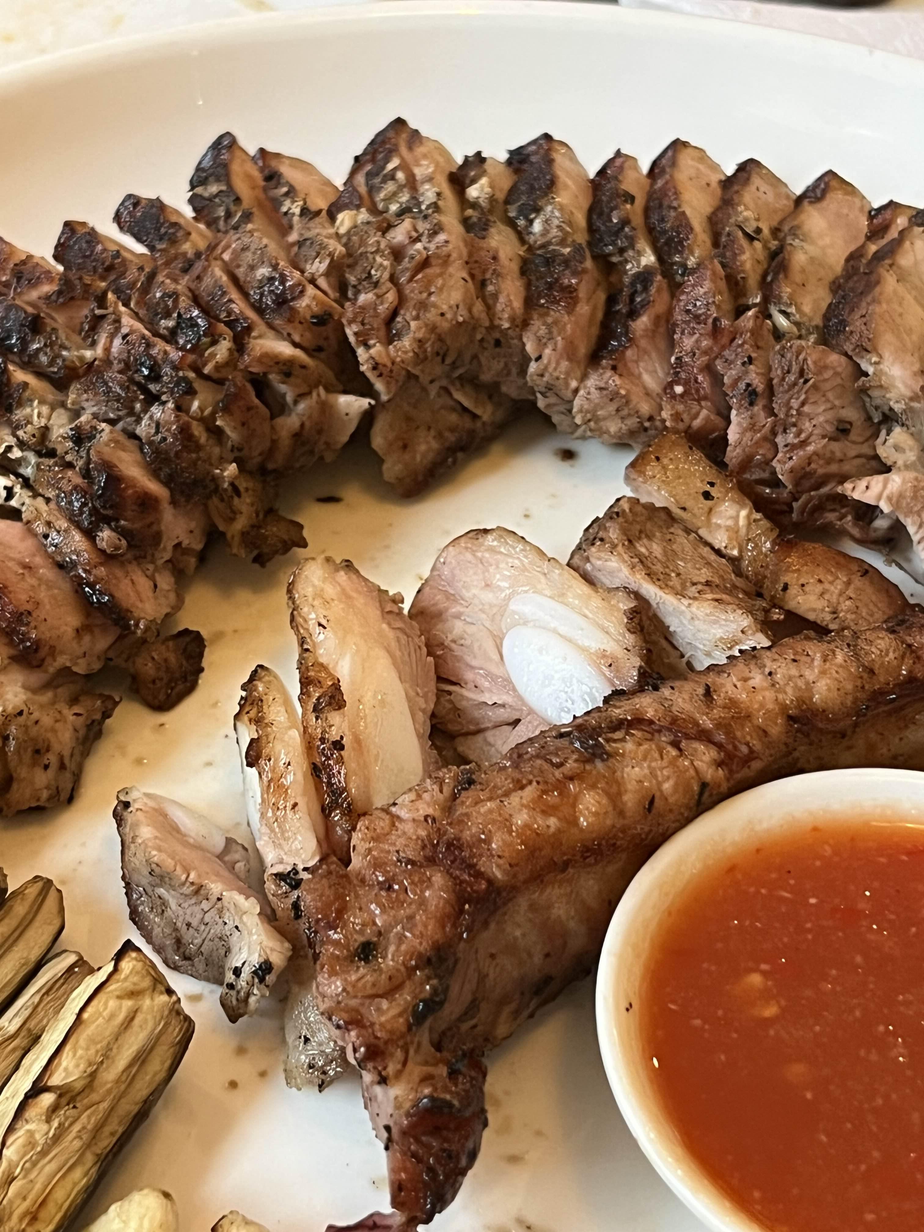 그릴에 굽는 데에 30분이 넘게 소요돼서 미리 예약하지 않으면 주문하기 어려운 돼지고기 바비큐다.